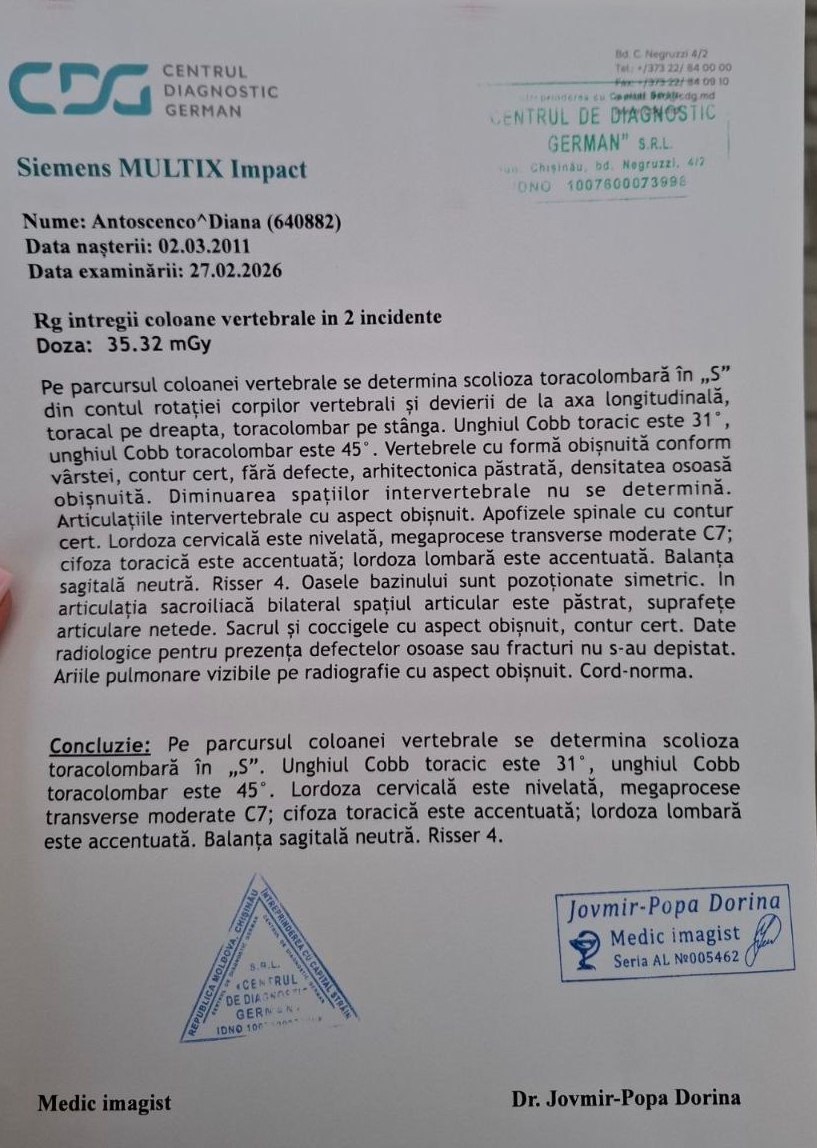 В Центре Матери и Ребенка в Кишиневе сказали прямо: без сложнейшей операции она может навсегда остаться прикованной к инвалидному креслу. Уже сейчас ей трудно стоять, нельзя поднимать ничего тяжелее 1 кг. Дальше — деформация грудной клетки и необратимые последствия.